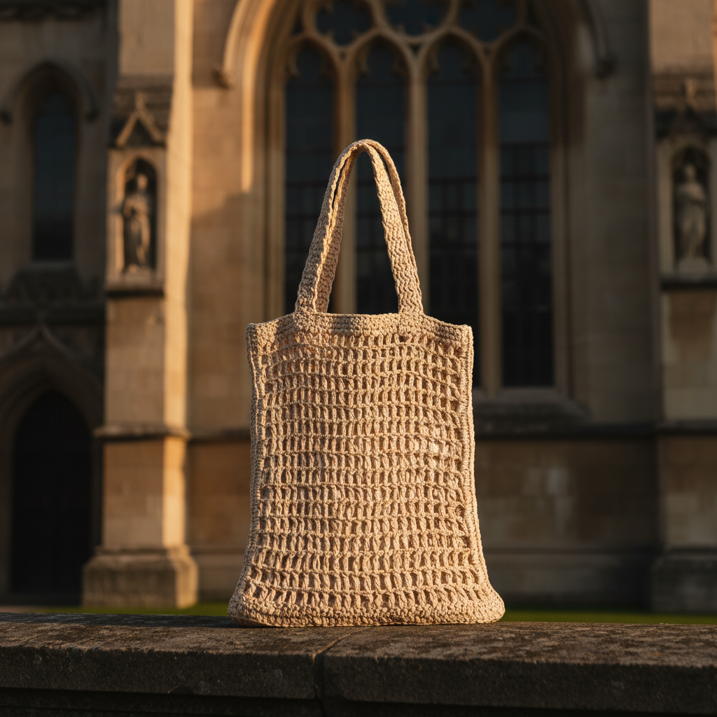 This elegant handmade crochet tote bag in a natural beige tone showcases a clean, open-weave pattern that perfectly complements modern ethnic fashion. Paired with a contemporary outfit, the bag highlights a minimalist yet sophisticated aesthetic. Its lightweight design and sturdy handles make it ideal for daily use, whether you’re heading out for casual errands, work, or a relaxed outing. Set against a grand architectural backdrop, the image captures the essence of timeless style blended with artisanal craftsmanship and sustainable fashion values.