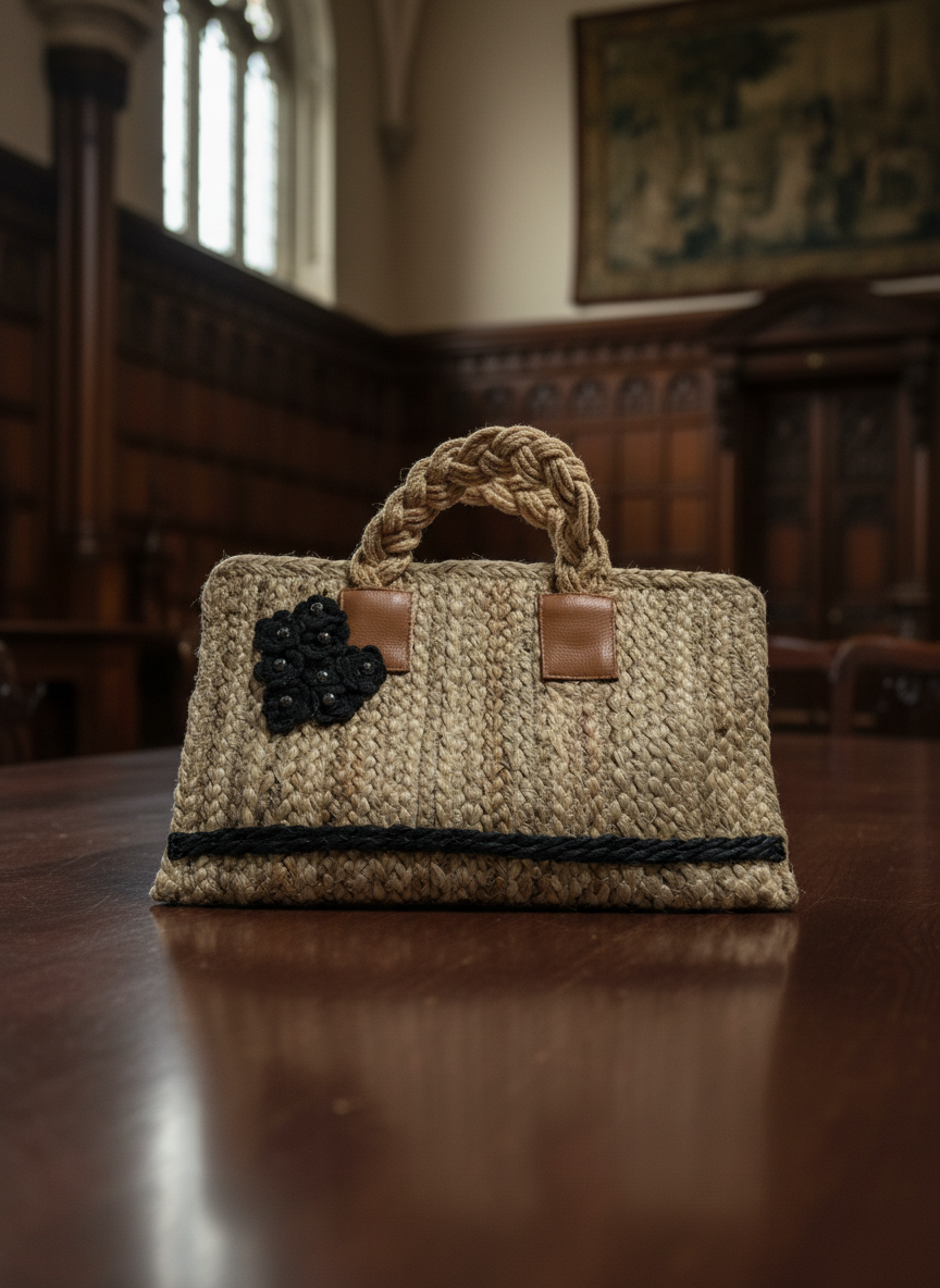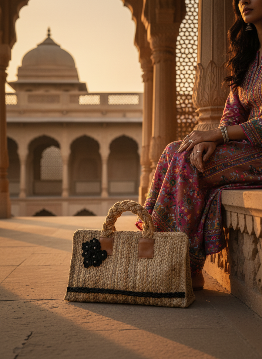 Stunning lifestyle shot of a handmade jute handbag featuring rope handles, black floral embellishment, and leather details. A woman in a colorful traditional Indian outfit sits gracefully in the background at a historic palace during sunset. Perfect for showcasing boho, ethnic, and sustainable fashion accessories. Ideal for summer vacation, resort wear, and Indian heritage fashion collections.