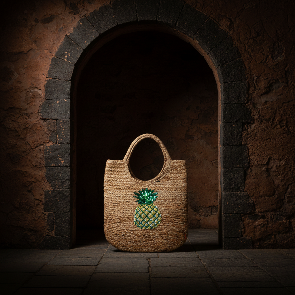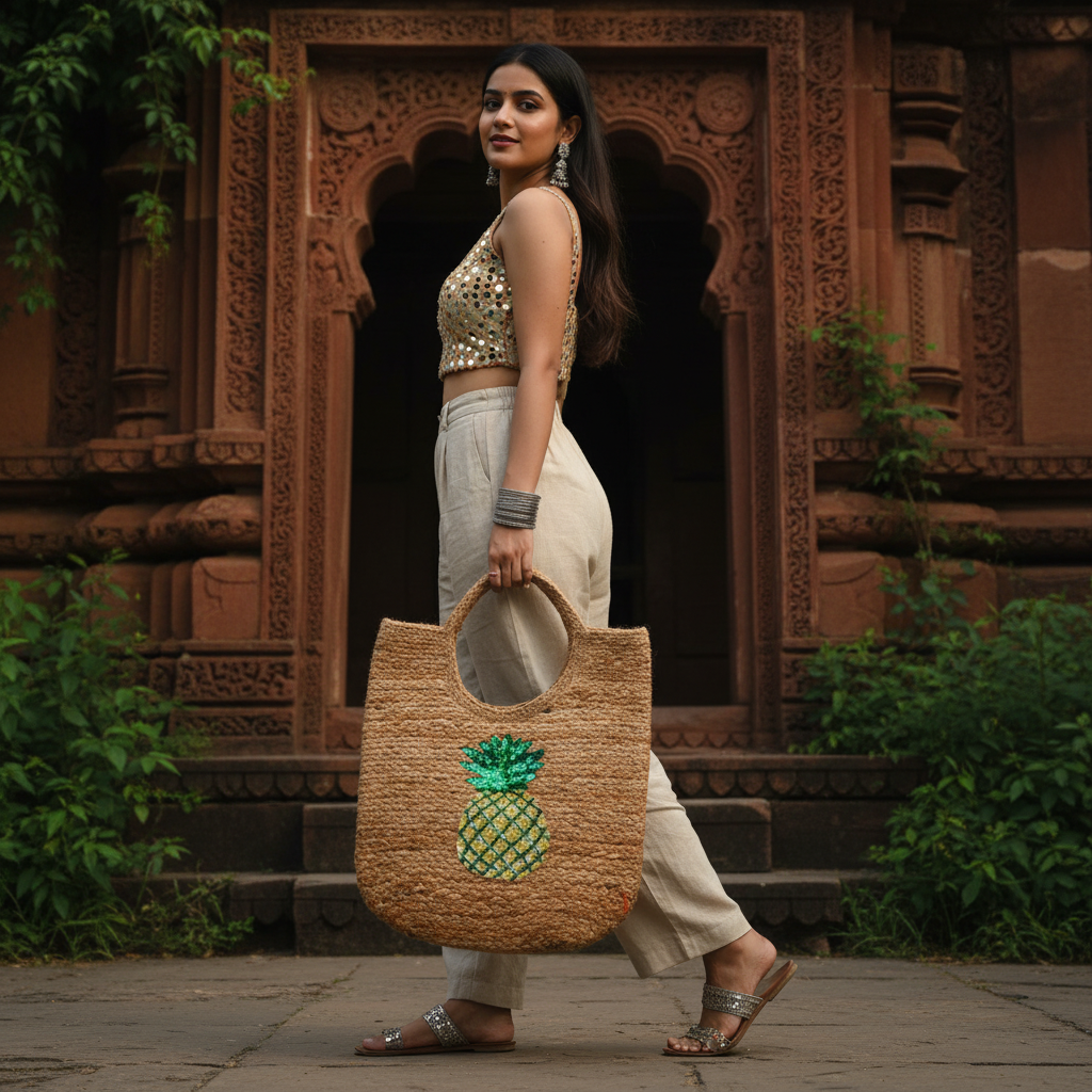 This beautifully handcrafted crochet tote bag features a classic striped design and the bag reflects the essence of artisanal craftsmanship and cultural richness.The lively background of handmade decor enhances the bag’s identity as a sustainable and culturally inspired fashion accessory.