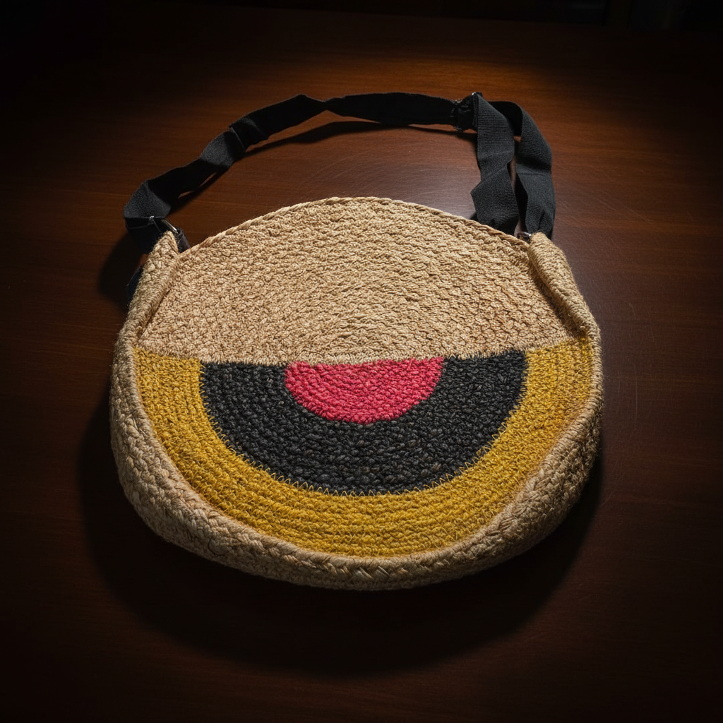 This unique round crochet sling bag showcases a beautiful fusion of traditional craftsmanship and contemporary design. Made with a natural beige base, it features a bold semicircle color-block pattern in mustard yellow, charcoal black, and vibrant pink, creating a visually striking centerpiece. The structured round shape adds a modern touch, while the sturdy black strap ensures comfortable crossbody wear. Ideal for casual outings, travel, or statement styling, this bag is both functional and fashion-forward, reflecting artisanal quality and timeless appeal.