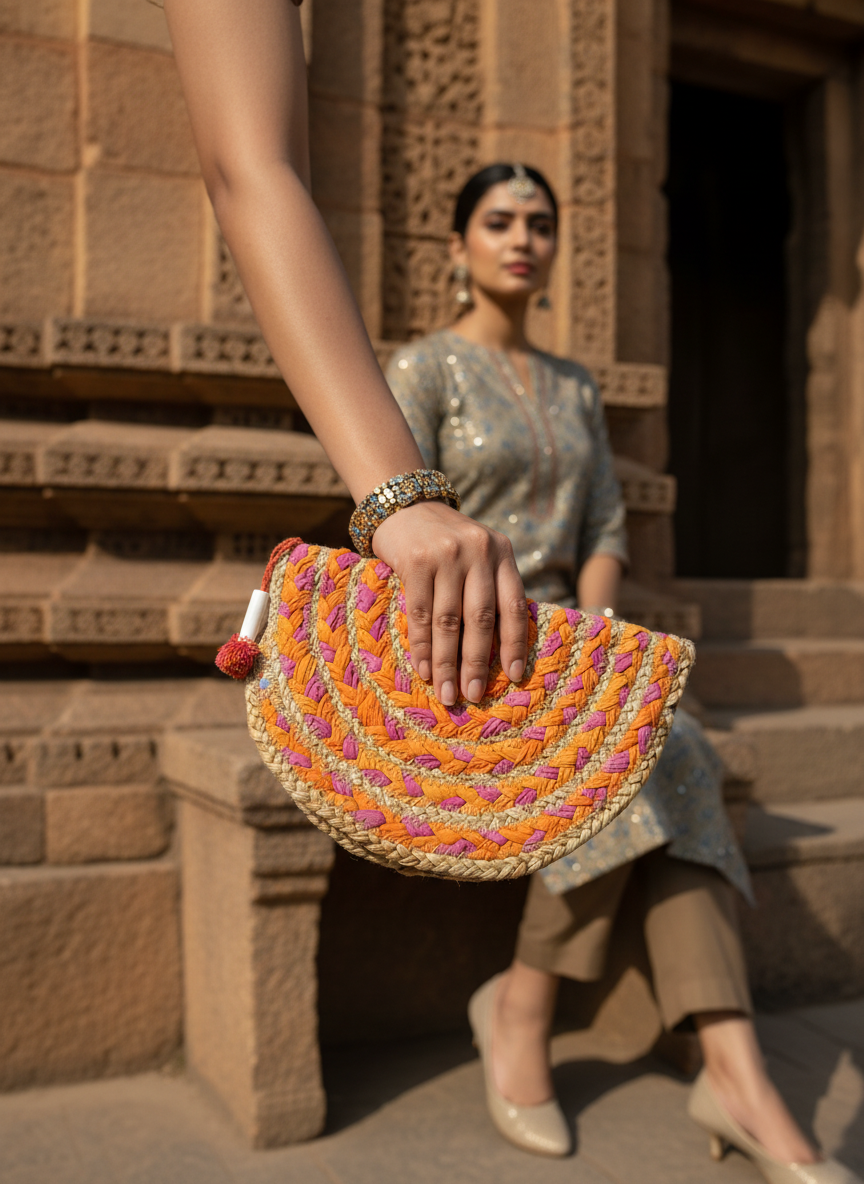Stunning lifestyle shot of a handmade jute handbag featuring rope handles, black floral embellishment, and leather details. A woman in a colorful traditional Indian outfit sits gracefully in the background at a historic palace during sunset. Perfect for showcasing boho, ethnic, and sustainable fashion accessories. Ideal for summer vacation, resort wear, and Indian heritage fashion collections.